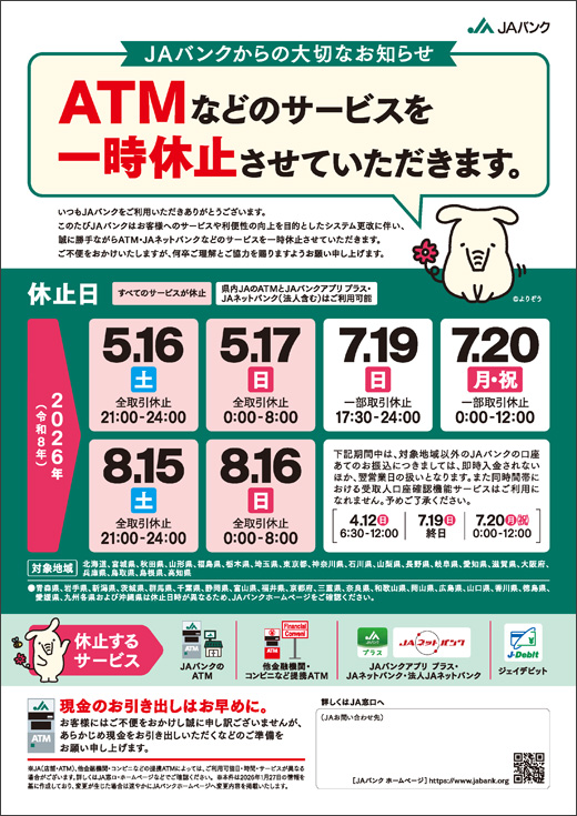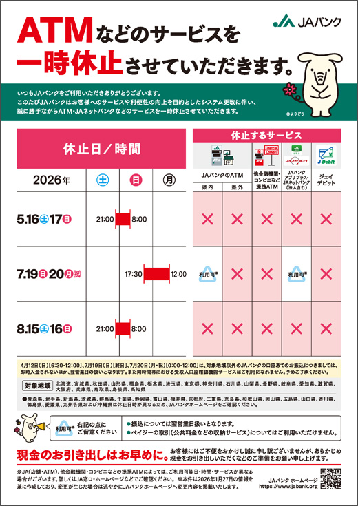 このたび、サービス向上および利便性のさらなる改善を目的としたシステム更改に伴い、ATMおよびJAネットバンク等の各種サービスを一時休止させていただきます。