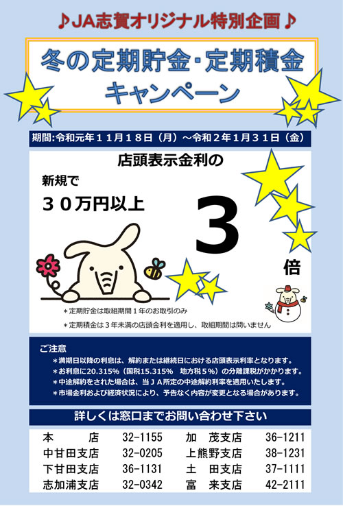 JA志賀オリジナル特別企画「冬の定期貯金・定期積金キャンペーン」がスタートしました!