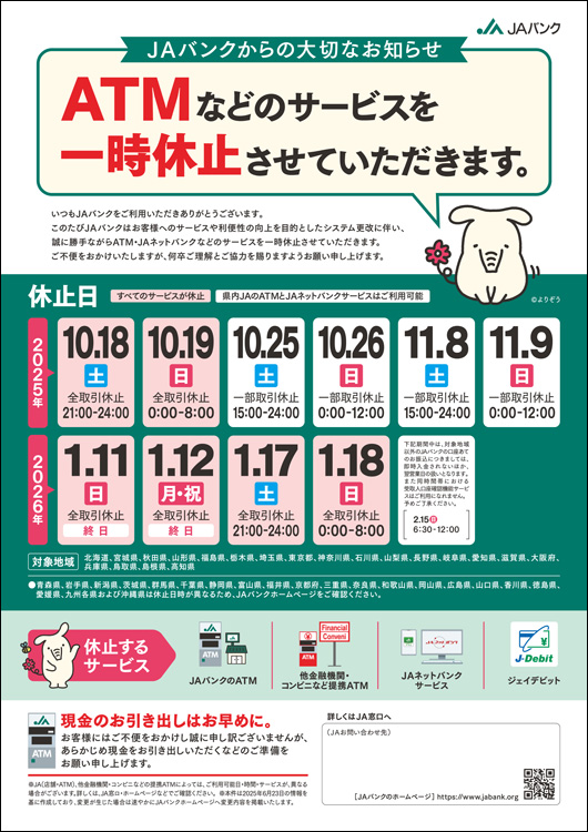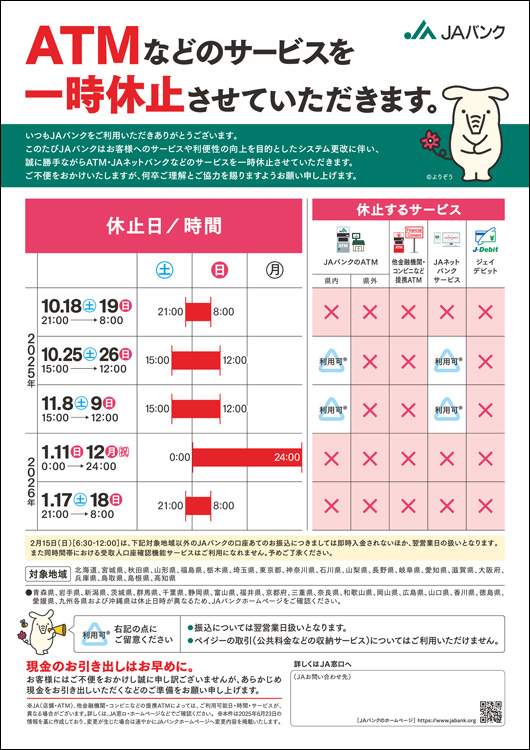 ATM等のサービス一時停止について